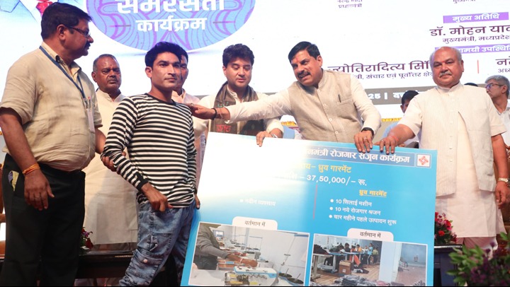 मुख्यमंत्री डॉ. मोहन यादव सहित अन्य अतिथियों ने पीएमईजीपी योजना के तहत श्रीमती रेखा खेमरिया को लगभग 9 लाख 40 हजार, श्री देवेन्द्र राठौर को लगभग 37 लाख 50 हजार व श्री नागार्जुन को लगभग 25 हजार रूपए की आर्थिक सहायता स्वरोजगारमूलक इकाई स्थापित करने के लिये वितरित की।