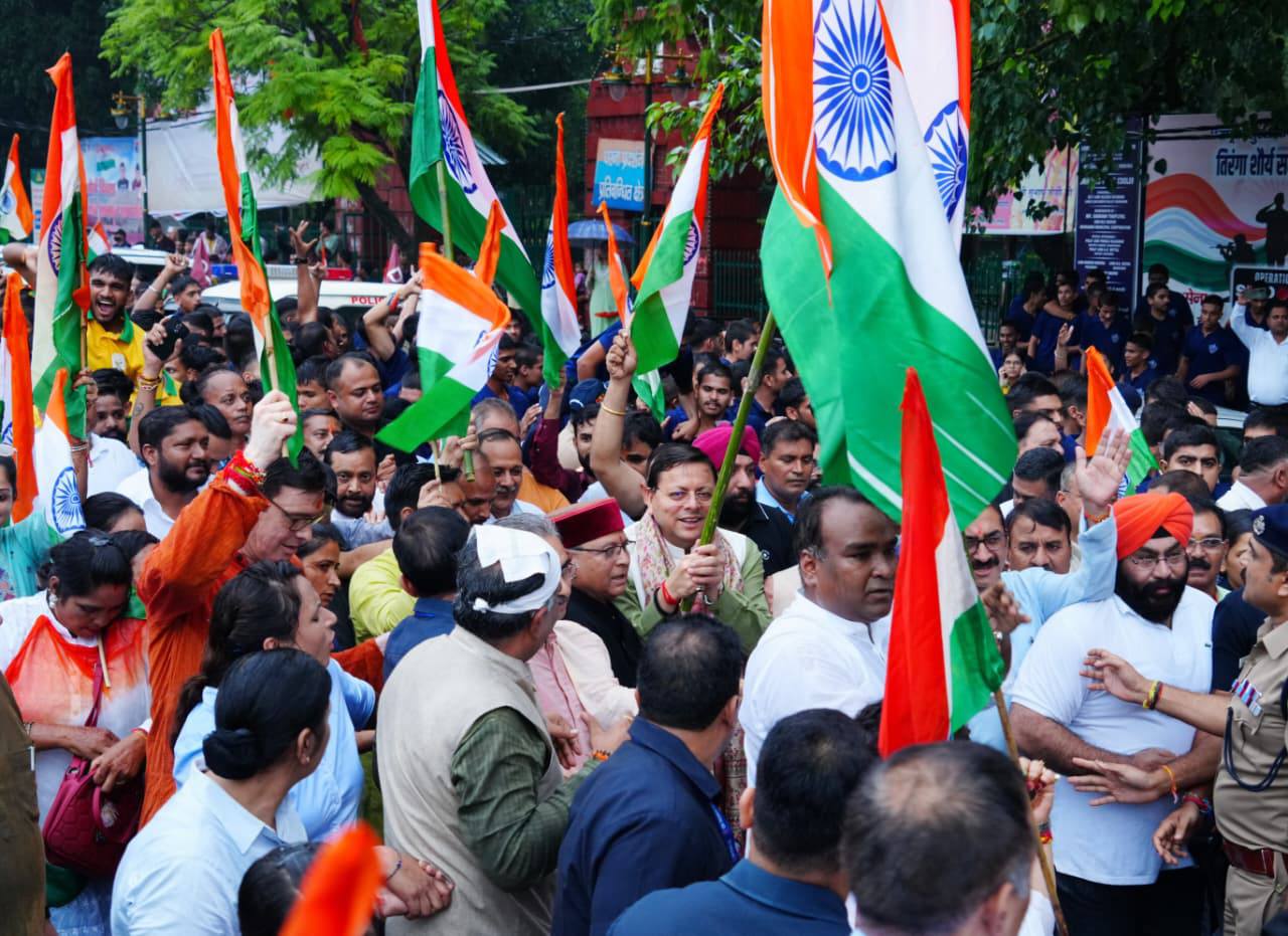 देहरादून -मुख्यमंत्री पुष्कर सिंह धामी ने बुधवार को गाँधी पार्क, देहरादून से जनप्रतिनिधियों, हजारों की संख्या में युवाओं, छात्र-छात्राओं, महिलाओं एवं बच्चों के साथ हाथ में तिरंगा लेकर ‘भारत मां की जयकार, वंदे मातरम’ की गूंज के साथ तिरंगा यात्रा का नेतृत्व किया। मुख्यमंत्री ने उपस्थित लोगों का उत्साहवर्धन किया, विशेषकर युवाओं का हौसला बढ़ाया। उन्होंने ‘हर घर तिरंगा’ अभियान (13-15 अगस्त) का शुभारंभ भी किया। राष्ट्रभक्ति के गीतों की धुनों के बीच मुख्यमंत्री ने तिरंगा यात्रा का नेतृत्व किया। मुख्यमंत्री ने युवाओं का अभिनंदन करते हुए सभी को स्वतंत्रता दिवस की अग्रिम शुभकामनाएं भी दी। तिरंगा यात्रा को देख लग रहा था कि मानो देहरादून की सड़कों पर समूचा भारत उमड़ पड़ा है।
