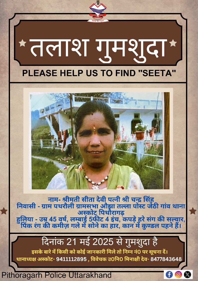 दिनांक 21 मई 2025 से गुमशुदा है यदि इसके बारे में किसी को कोई जानकारी मिले तो निम्न नंबरों पर सूचना दें।