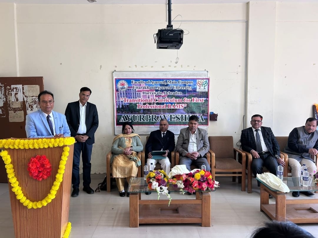 हर्रावाला (देहरादून)। उत्तराखंड आयुर्वेद विश्वविद्यालय के आयुर्वेद संकाय में सोमवार को आयोजित आयुर–प्रवेशिका कार्यक्रम में राष्ट्रीय आयुष निर्यात एवं नियामक मंडल (एनसीआईएम) के चेयरमैन प्रो. बी.एल. मेहरा ने विद्यार्थियों के समक्ष आयुर्वेद के भविष्य और उसके वैश्विक महत्व पर संजीदा और प्रेरणादायक व्याख्यान दिया। समारोह की अध्यक्षता कुलपति प्रो. अरुण कुमार त्रिपाठी ने की।